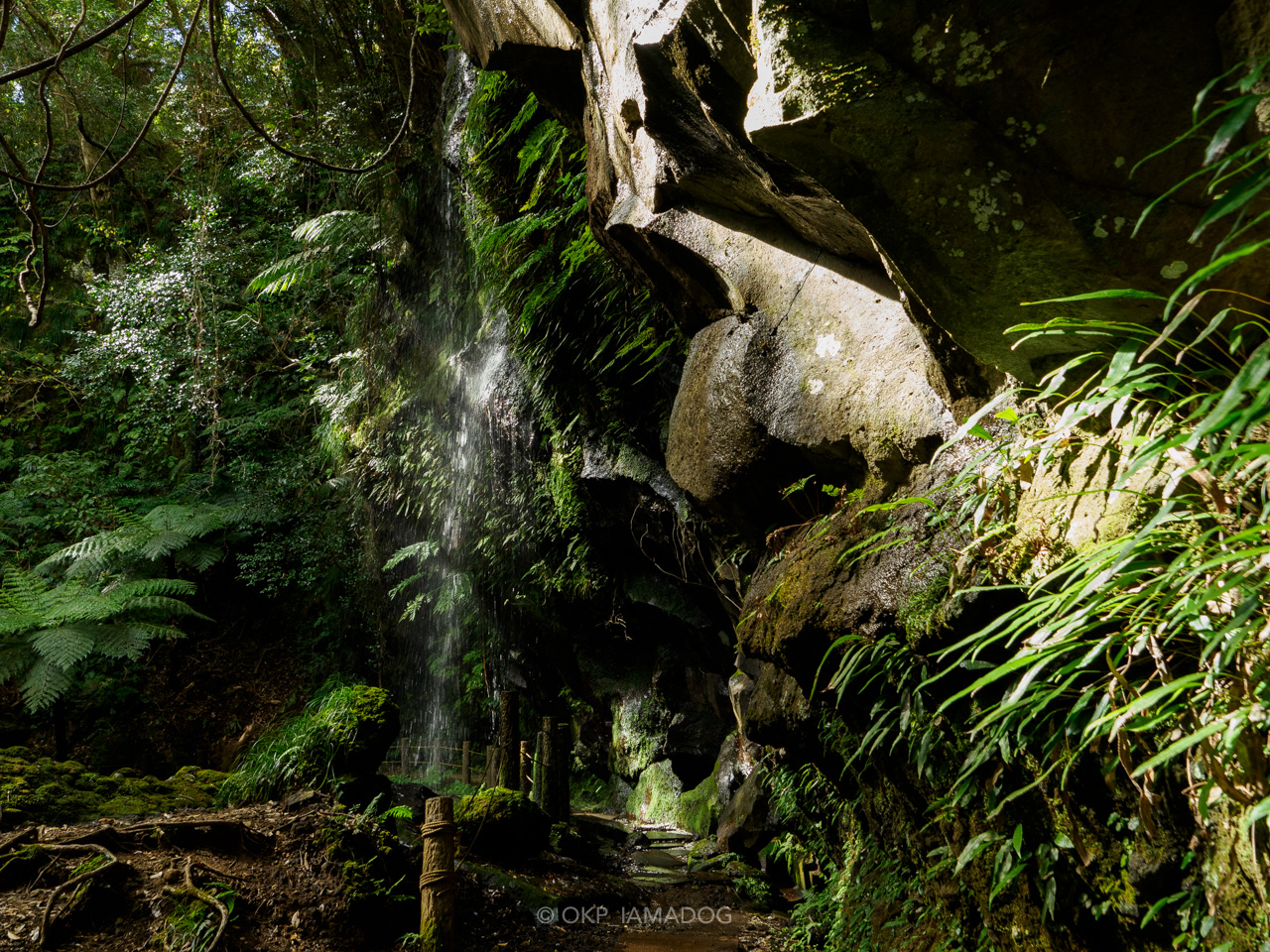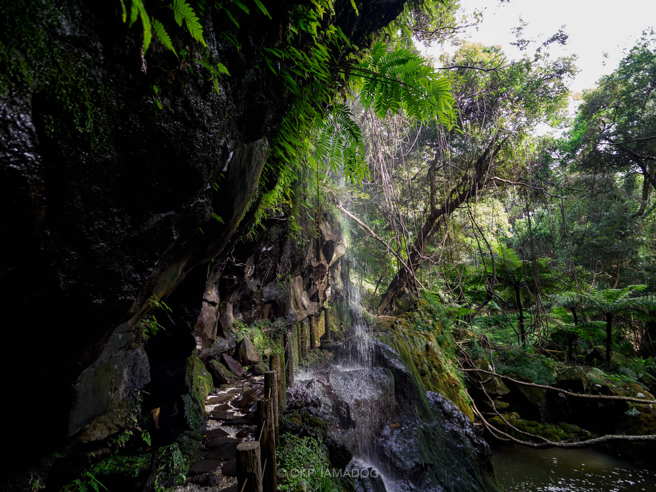 遊歩道がいきなり滝の裏側へ……。