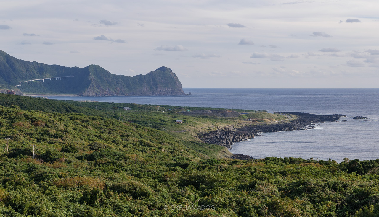 午前中に立ち寄った大坂トンネル展望台のある橋が見えています。右手前に見える黒っぽい磯が「南原千畳敷」と呼ばれる溶岩です。八丈島一周も残りわずか。