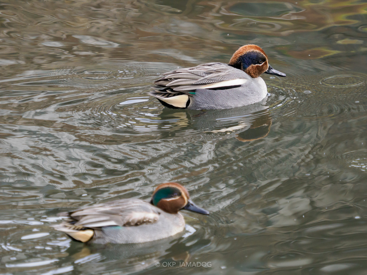 コガモはメスをほったらかして(?)オスが2羽で行動してる場面をよく見かけます。