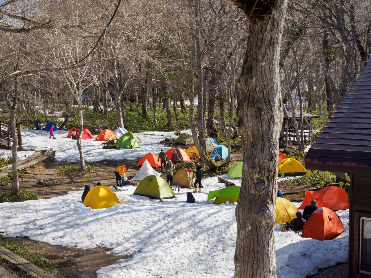山の鼻に到着。GW期間だというのに(この天気に中日の平日なこともあってか)テントも少なめ。