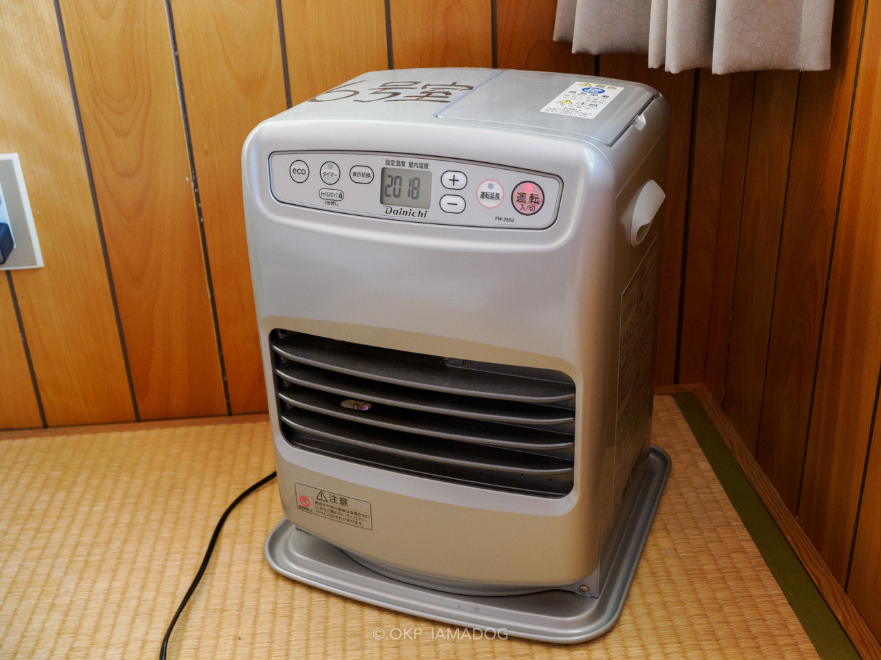 個室内には石油ファンヒーター。朝夕はまだ冷える時期ですし、これは嬉しいですね。
