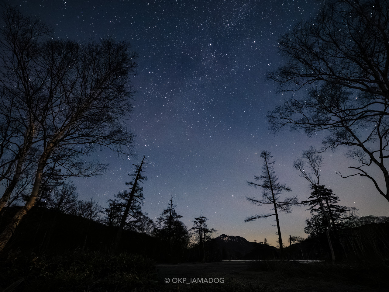 月がそろそろ沈む2時過ぎに目覚ましを掛けて外を見たら、結構山荘の照明のせいであまり星は見えなかったのですが、せっかくなので外に出て植物研究見本園あたりまで行ってみます。しばらく暗闇にいると徐々に星が見えてきました。写真を撮ると天の川も薄っすらですが映ってます。