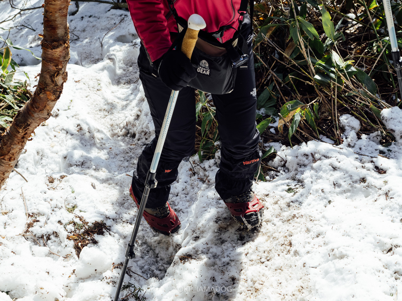この先は樹林帯の急登が続くのでチェーンスパイクを装着。
