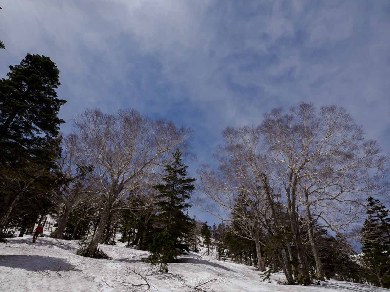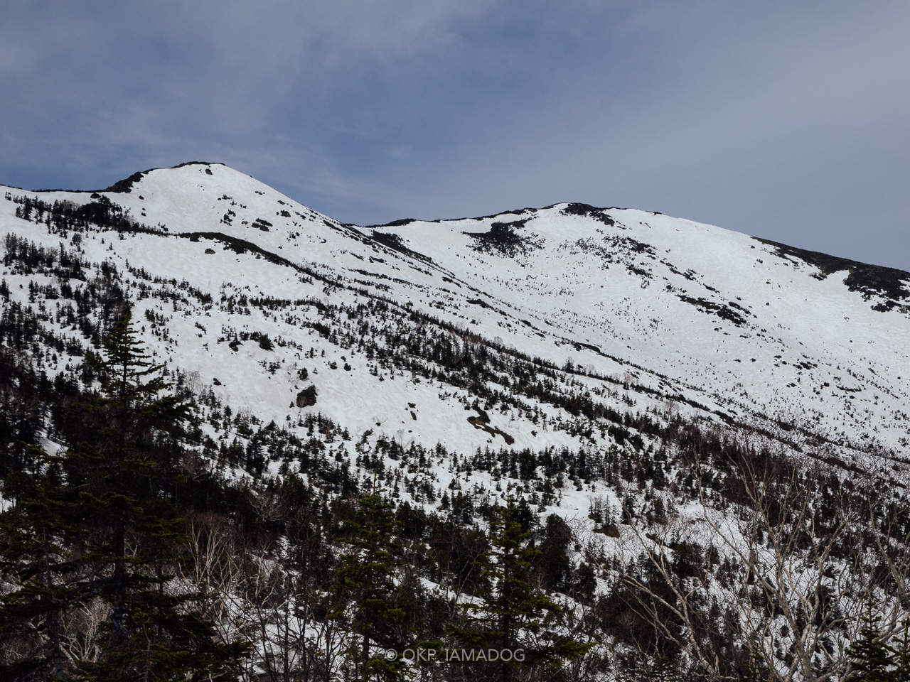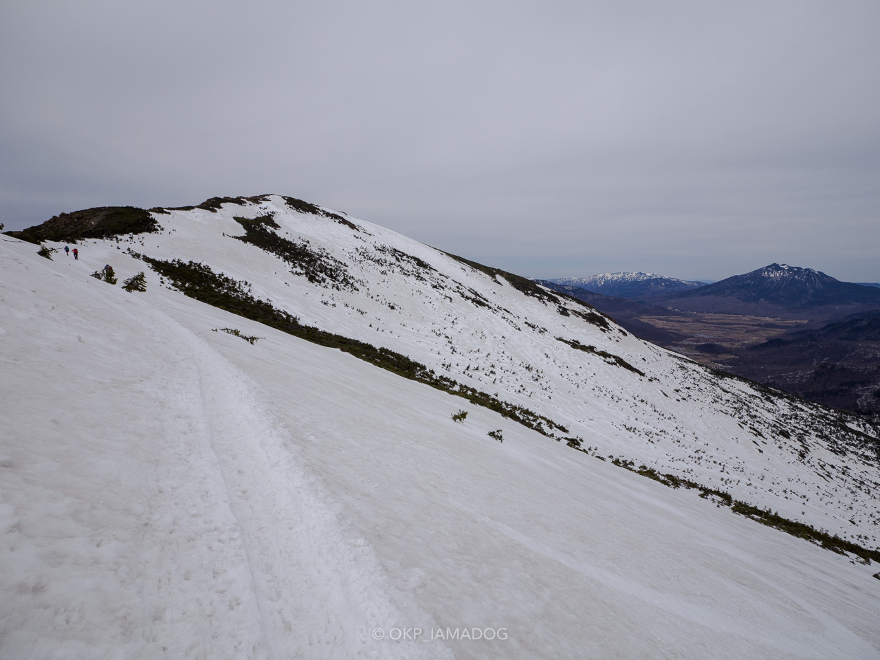 斜面がかなり急になってくるのでトラバース気味に登っていきます。私達はチェーンスパイクでしたが、下山だったり不安な人はツメのしっかりあるアイゼンを使ってもいいかも。昔使ってたラチェットタイプの軽アイゼンってこういうときに欲しくなります。そういえば夏道だと森林限界あたりから急登&よく滑る蛇紋岩ゾーンが続くので、雪に覆われた残雪期の方が登りがスムーズです