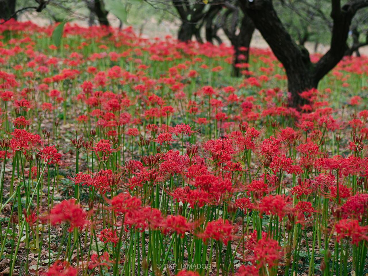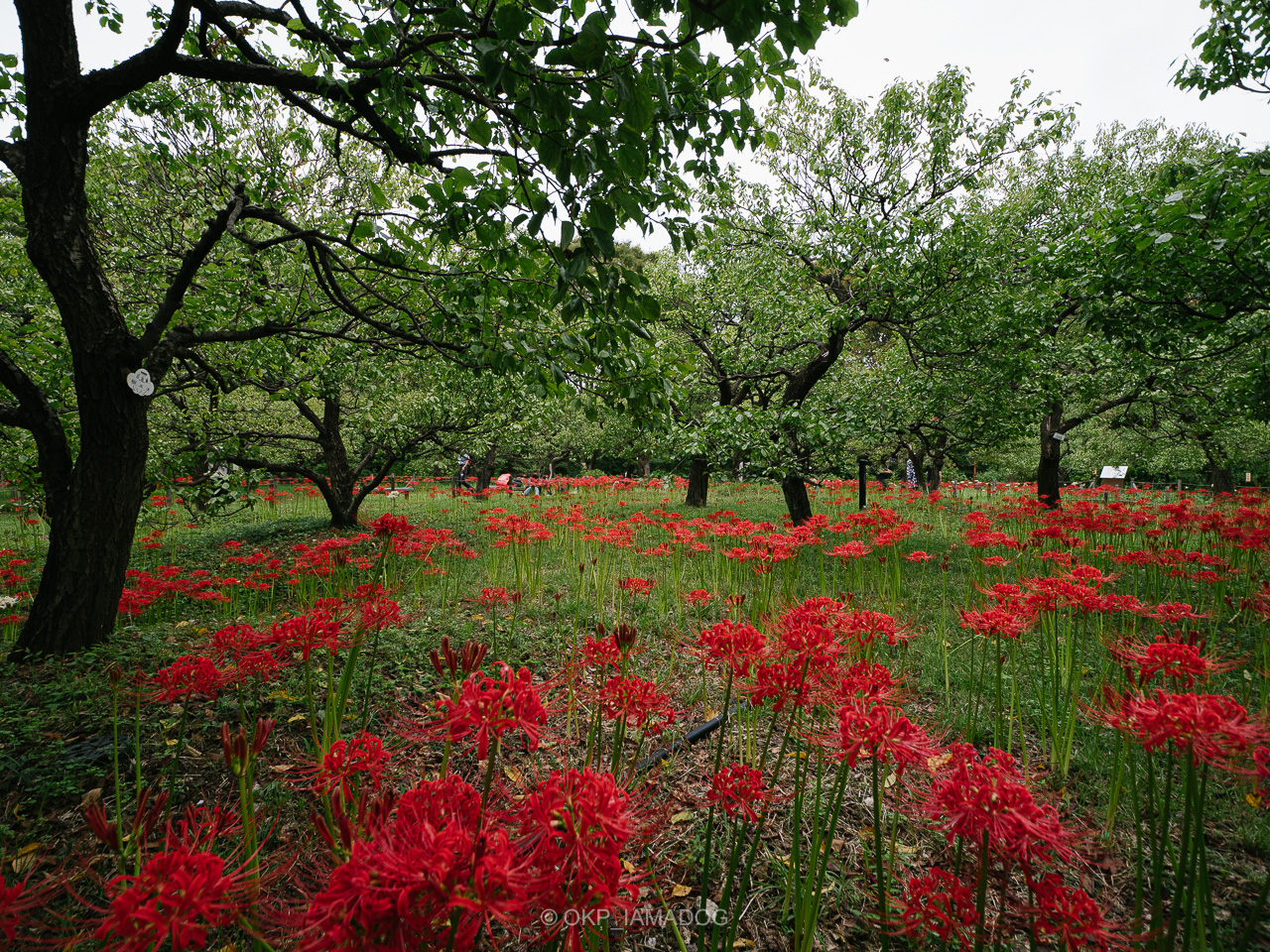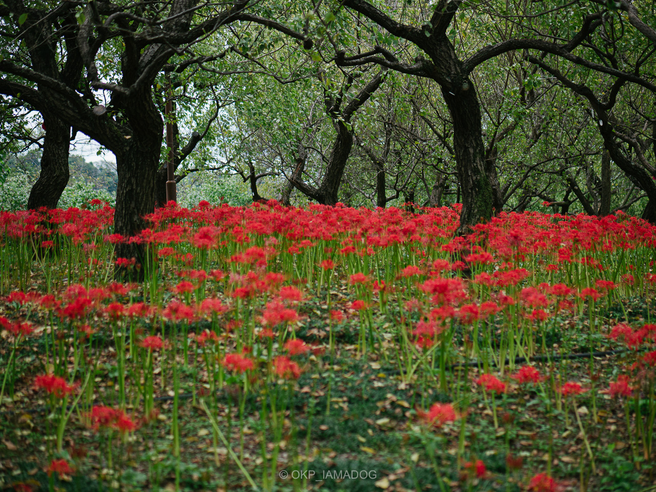密度はそこそこながら、広大な梅園で真っ赤なヒガンバナが一斉に花を咲かせています。