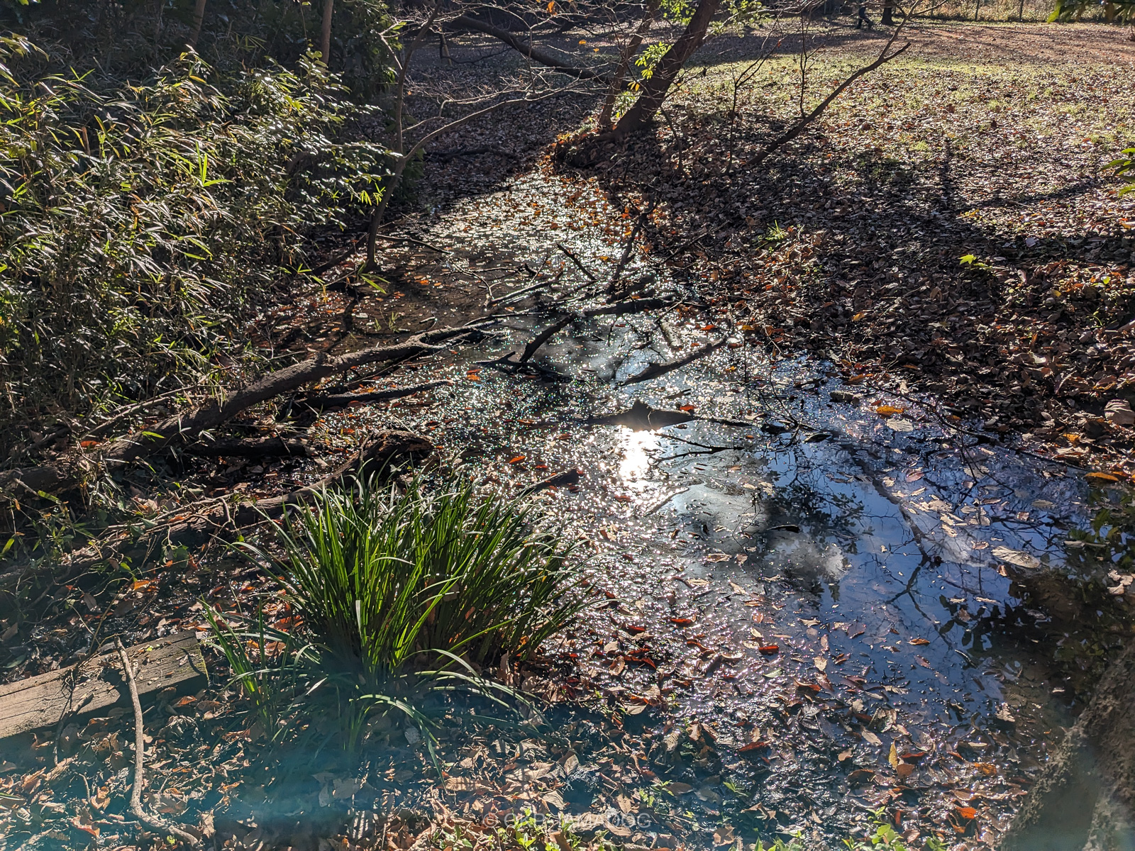 敷地内からは豊富な水が流れています。国分寺崖線からの湧水と思われますが、この水を利用して水田などの実習を行っているようです。地図を見ると神代植物公園内の水も、こちらに流れているのかも?