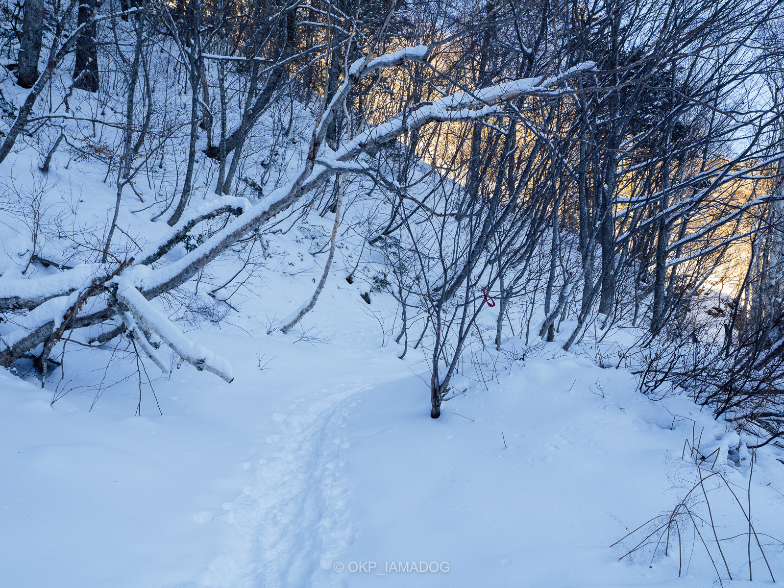前日にも多少の降雪があったようなので、トレースはこの日の先行者だけ。雪はサラサラです。