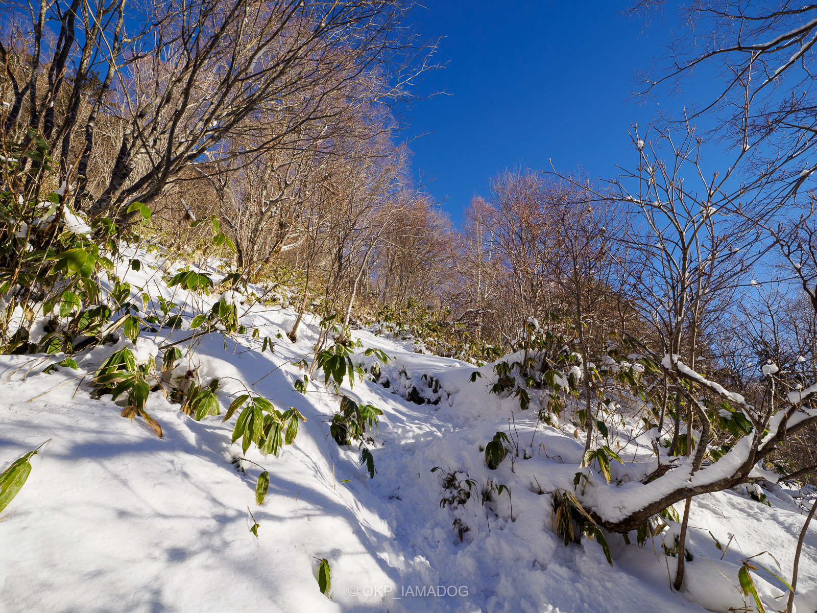 夏山だと木の根や岩、階段など細かな段差で思いの外に下るのがダルい樹林帯の下山路も、雪が付いてしまえば高速道路。足さえ動かしていればサクサクと下りることができます。