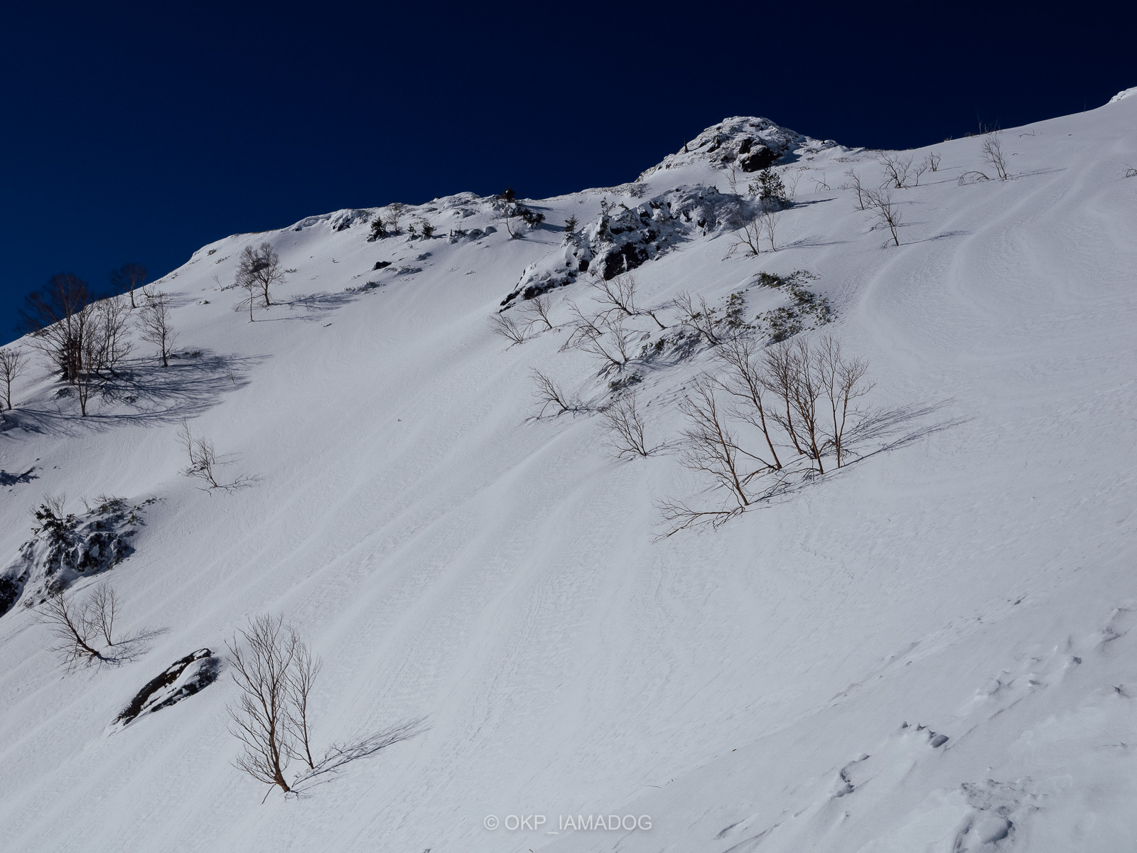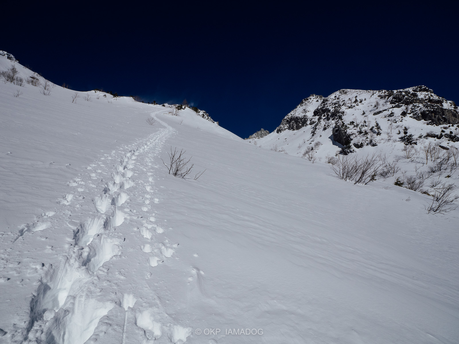 北峰ルートのトレースはありませんが、左手の木々の脇と谷の際を鞍部に向かって登って行く感じ。