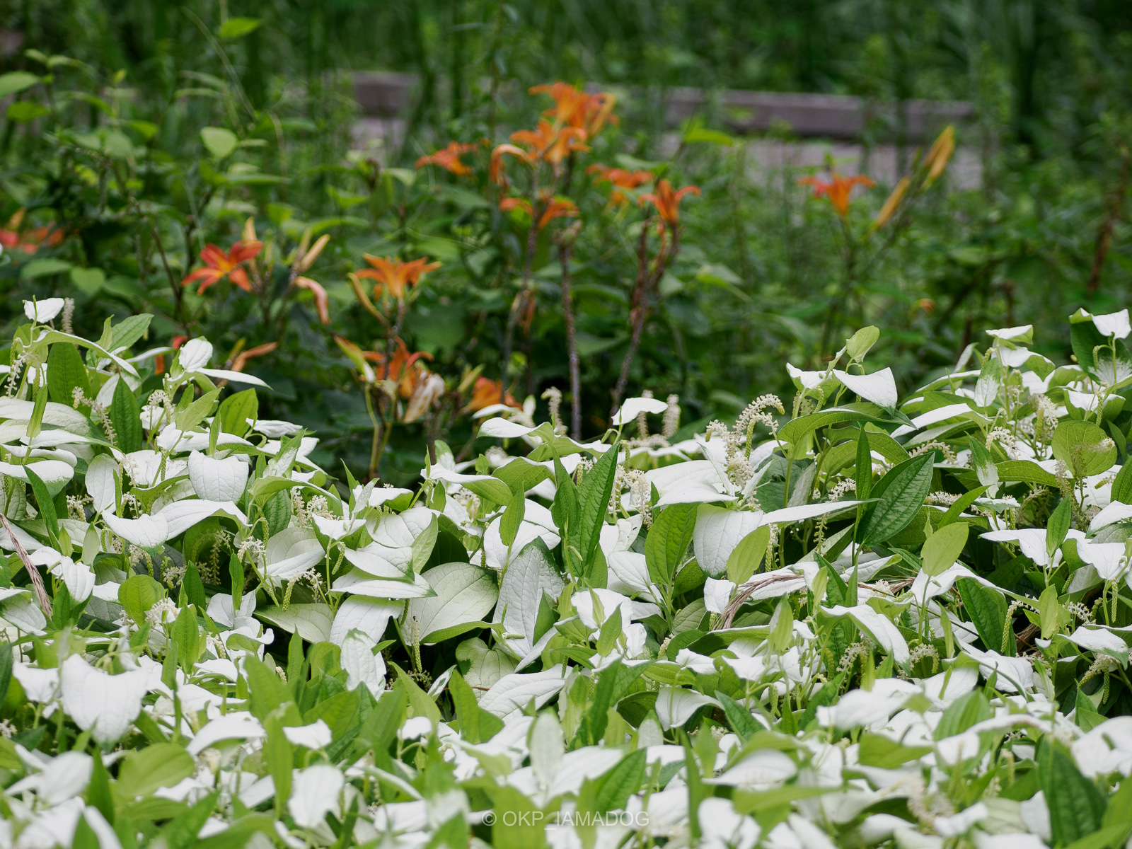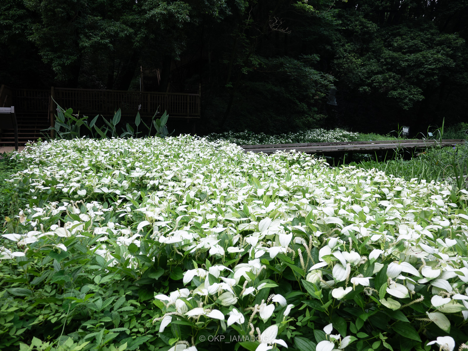 白い葉のハンゲショウが花を咲かせています。