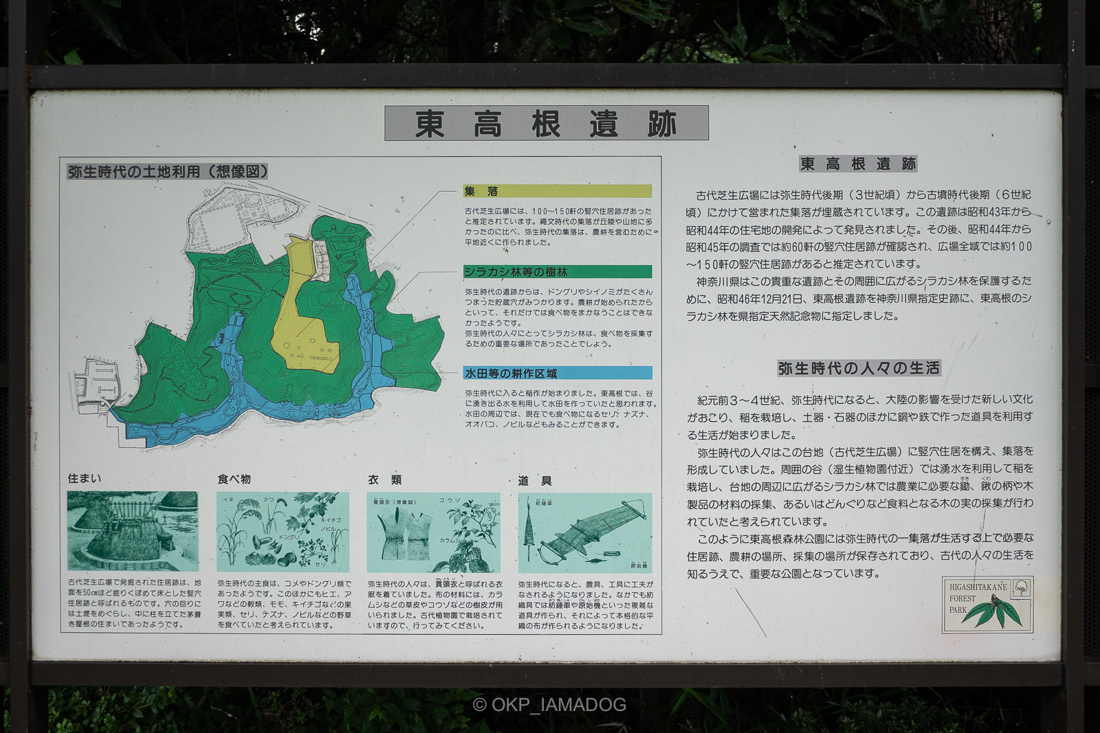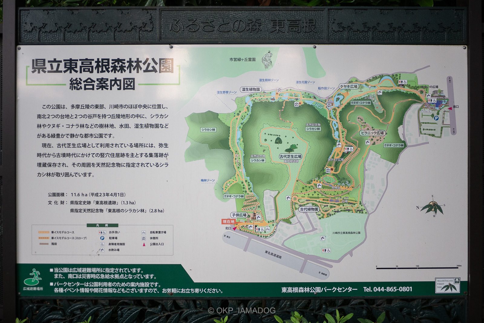 東高根森林公園は11haを越える広大な緑地(県立公園)で、湿生植物園の他、神奈川県の天然記念物にも指定されているシラカシ林、神奈川県指定史跡の東高根遺跡(古代芝生広場)などもあります。2つの谷戸の奥から流れ出した流れが南口(下地図の右手側)に向かって流れています。