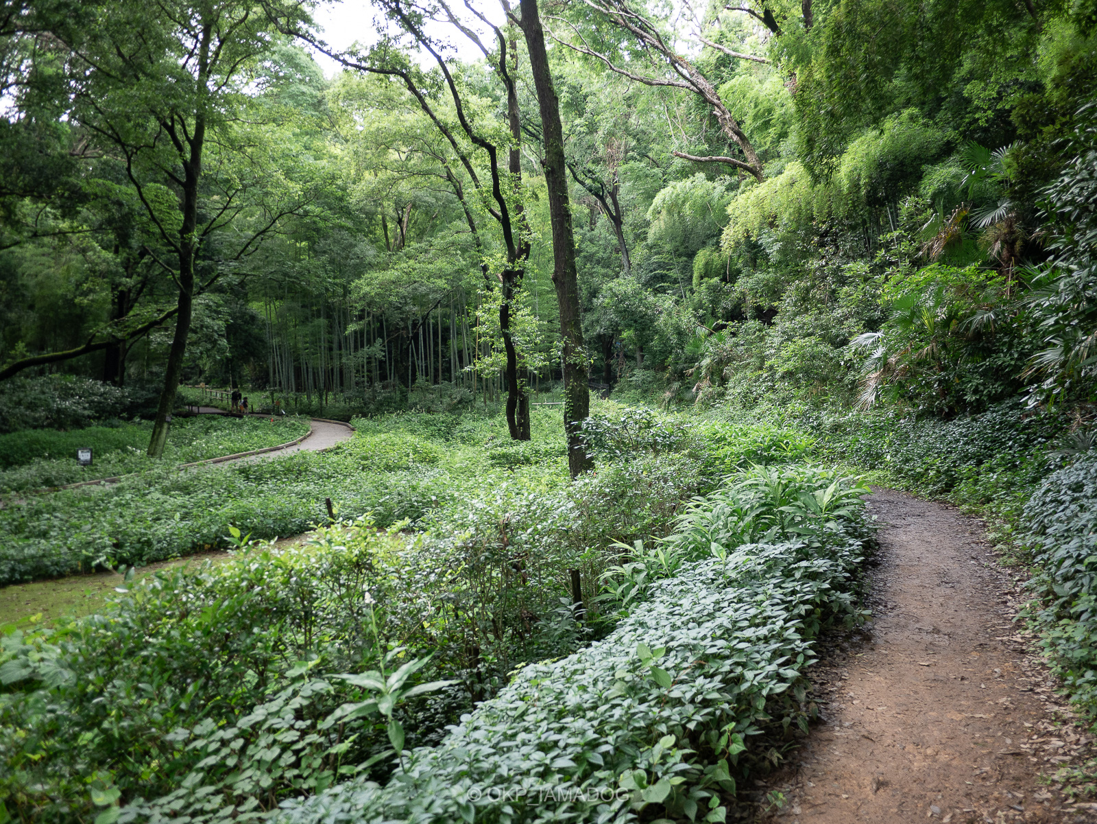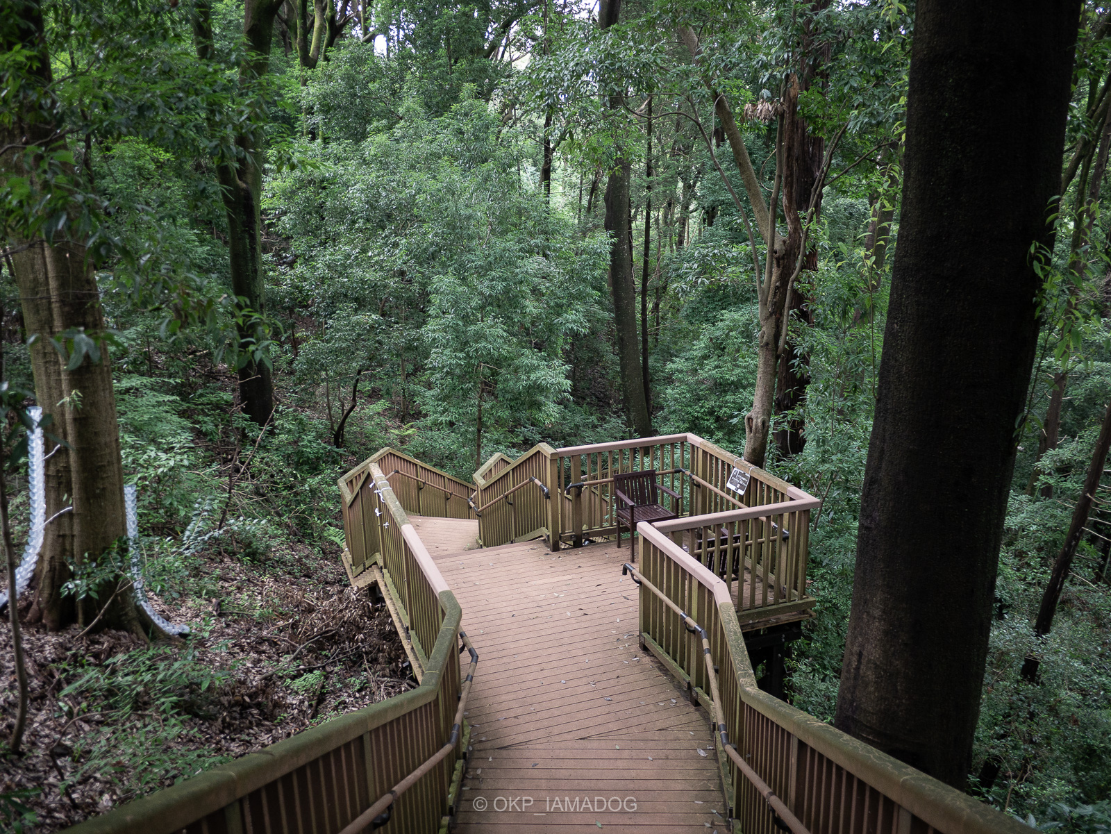 シラカシ林の中を抜ける木道。
