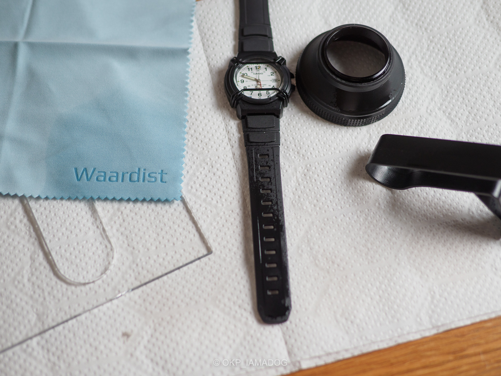 ディートが影響ありそうな樹脂素材、さすがに普段使っているもので試すのは嫌だな…… と思いつつ、家の中からダメージを負っても許せそうなものをいくつか選んでみました。硬くてやや弾性のあるプラスチック、透明のアクリル樹脂(無印のティッシュケース)、チープカシオの樹脂バンド、レンズのラバーフード(シリコンゴム?)、そして化繊布として未使用のマイクロファイバークロスです。