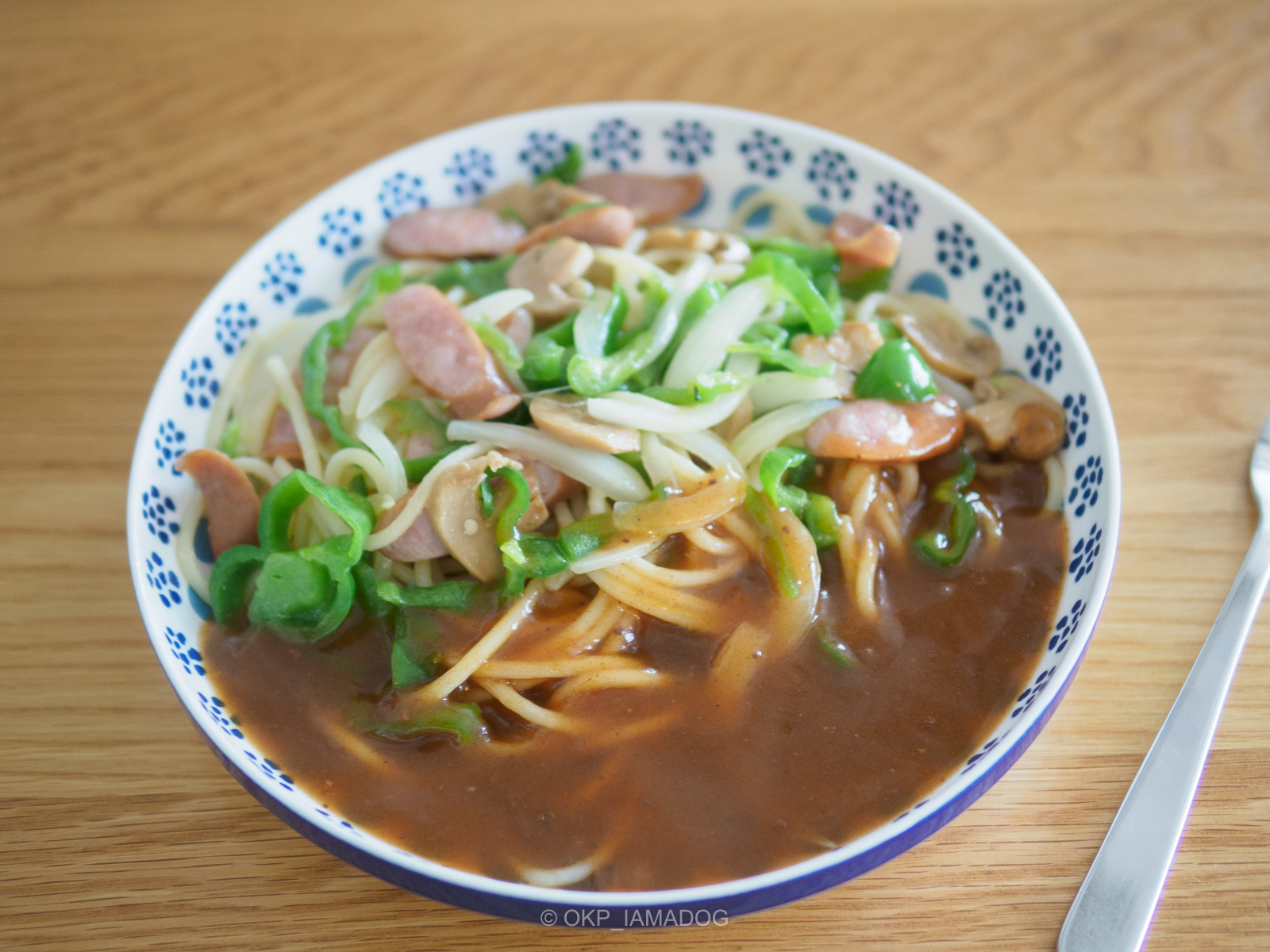 ヨコイのソースであんかけスパ、ピーマン多め。