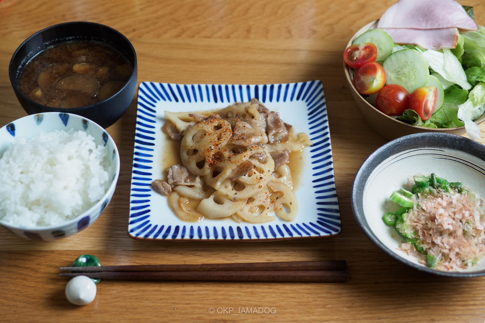 刻みオクラに鰹節と醤油。子どもの頃から好きで、生で全然食べられるんですけど妻は火を通して欲しいみたいなので、軽く熱湯に浸してます。地物の新鮮なやつなら生で全然美味しく食べられるのに…(と台所でつまみ食いをしている)。主菜はれんこんと豚バラの甘酢炒め、好きなので1年中食べてる。