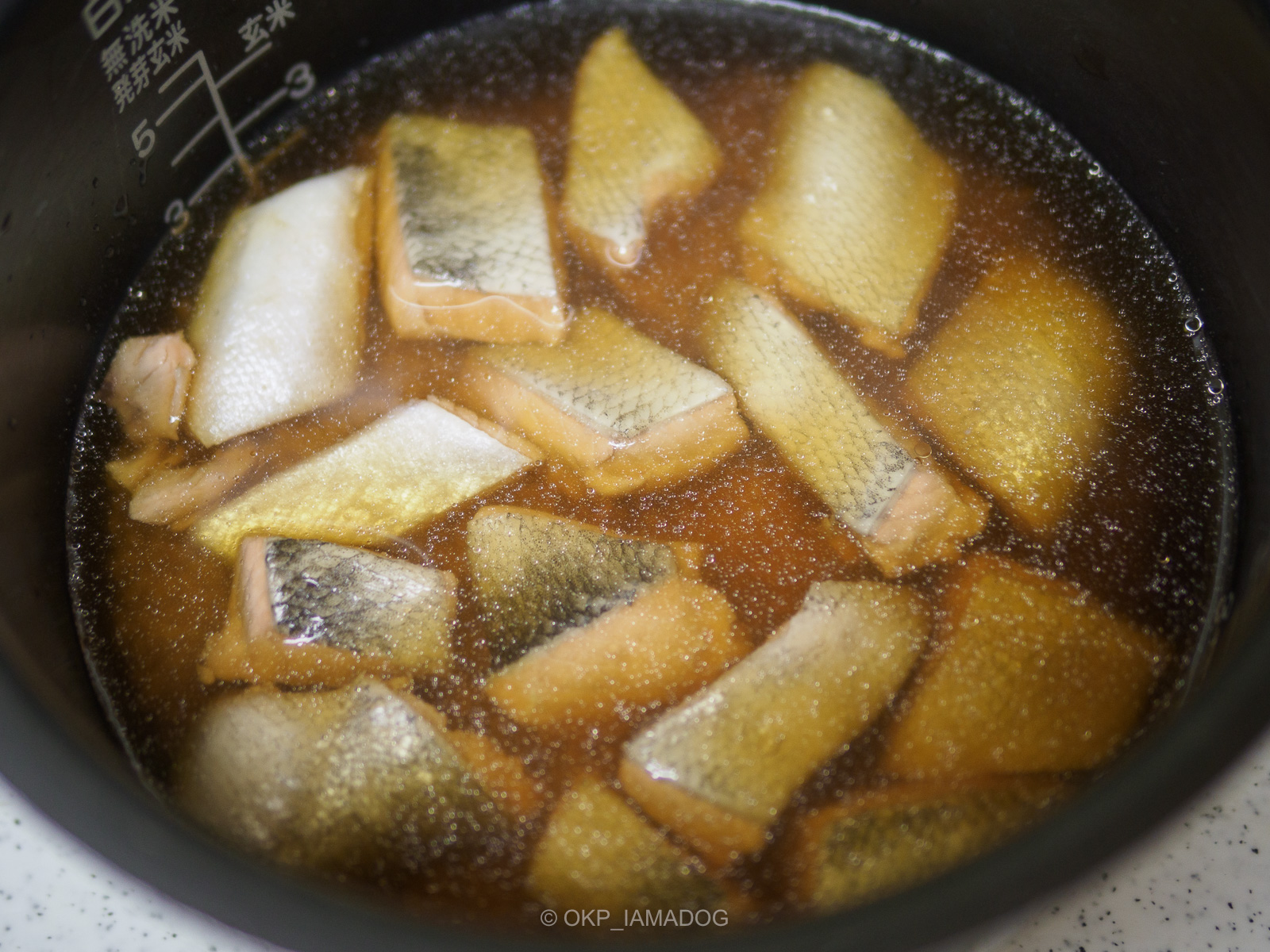 米と鮭を生鮭を煮た煮汁で炊きます。炊きあがり。