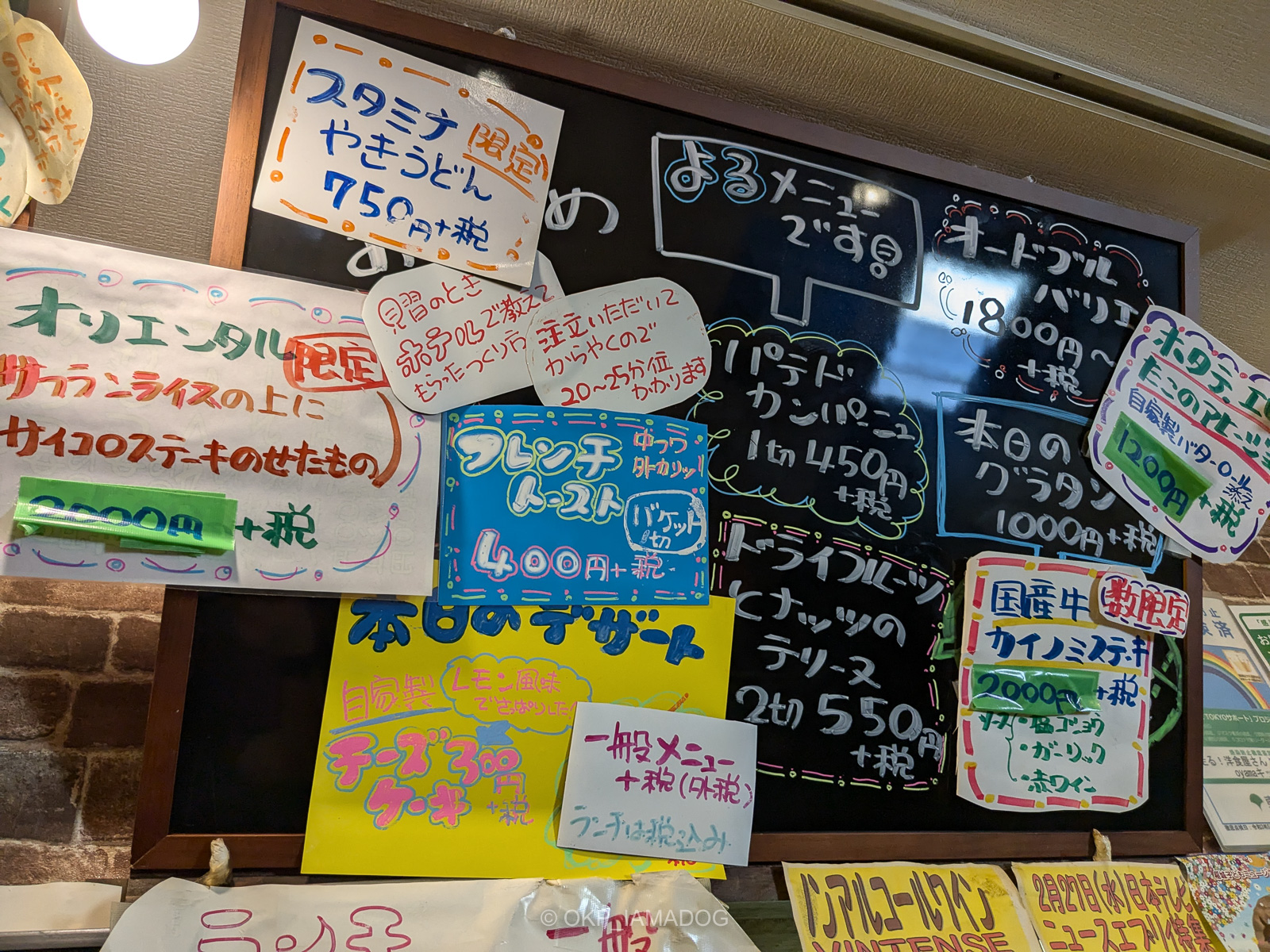 ランチメニューはオムランチ、タコランチ、ロコランチ(それぞれオムライス、タコライス、ロコモコのセット)とパスタのセット。それぞれにミニサラダやミニグラタン、サラダなどが付いています。お値段すべて850円!安っ!