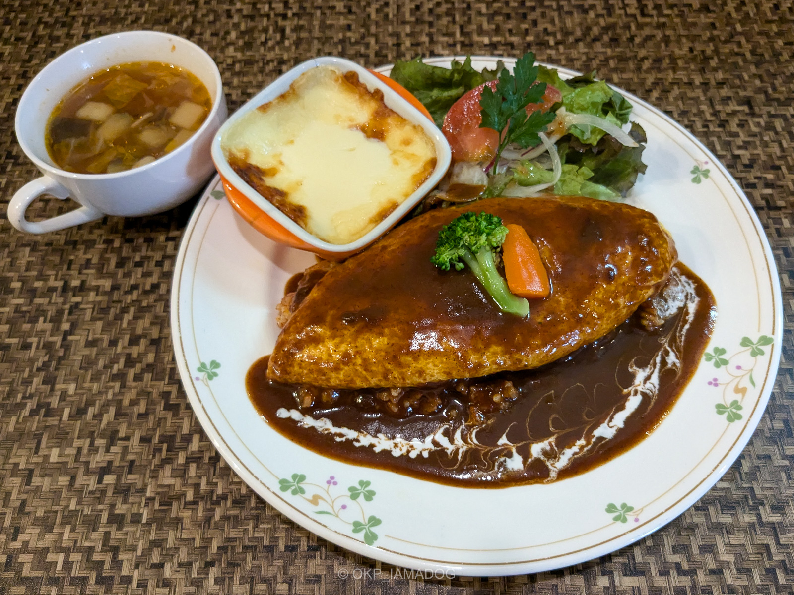 オムライスを注文しました。ケチャップライスの上に大きなプレーンオムレツ、そしてたっぷりのデミグラスソース。スープにグラタンまで付いています。これは美味しそう! というか今どき850円とは思えない構成!