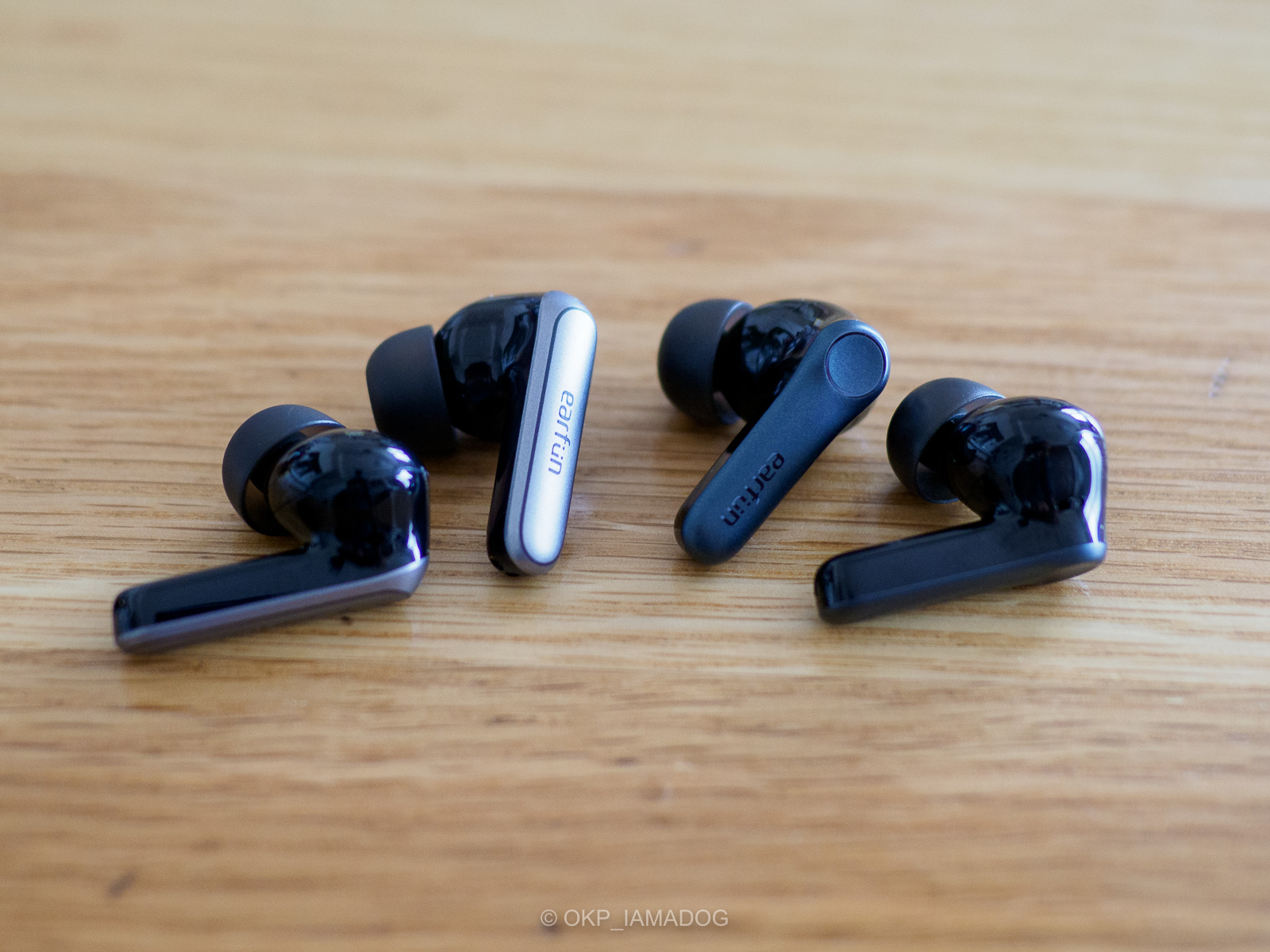 装着してみると私の耳にはかなりフィット感がよく、やはりフィット感の良かったEarFun Air Pro 4とほぼ同じつけ心地(これは個人差があるかも)。確かに並べてみると(写真左がAir 2 NC、右がAir Pro 4)耳の外に出る部分のデザインは違っても耳に収まる部分の形は似ているかも。