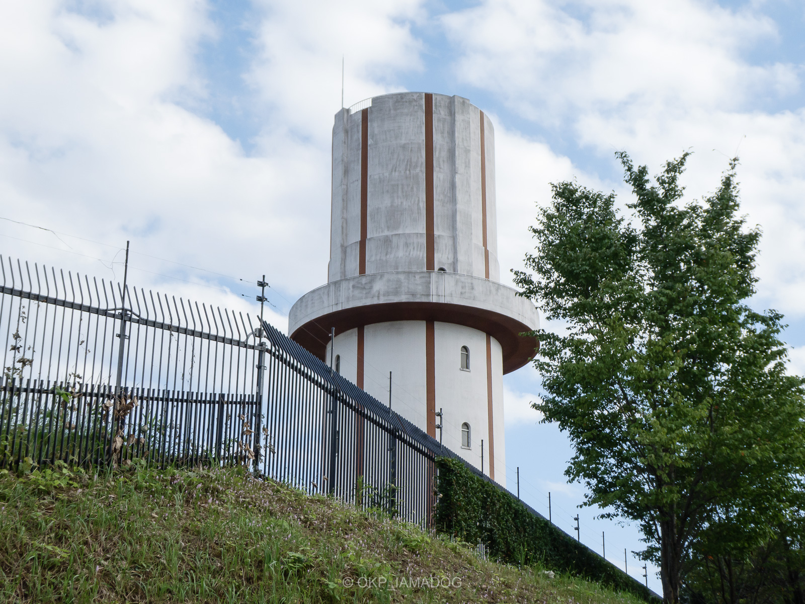 今回取り上げる給水塔では最もに西にある、デザインのユニークさでは向陽台給水所に負けてない八王子市鑓水の鑓水給水塔。小山内裏公園の西、「戦車道路」としても知られる尾根緑道を挟んである鑓水小山給水所内の給水塔です。多摩丘陵ですが丘陵の中では少し低くなった場所にあります(その分高さがある)。