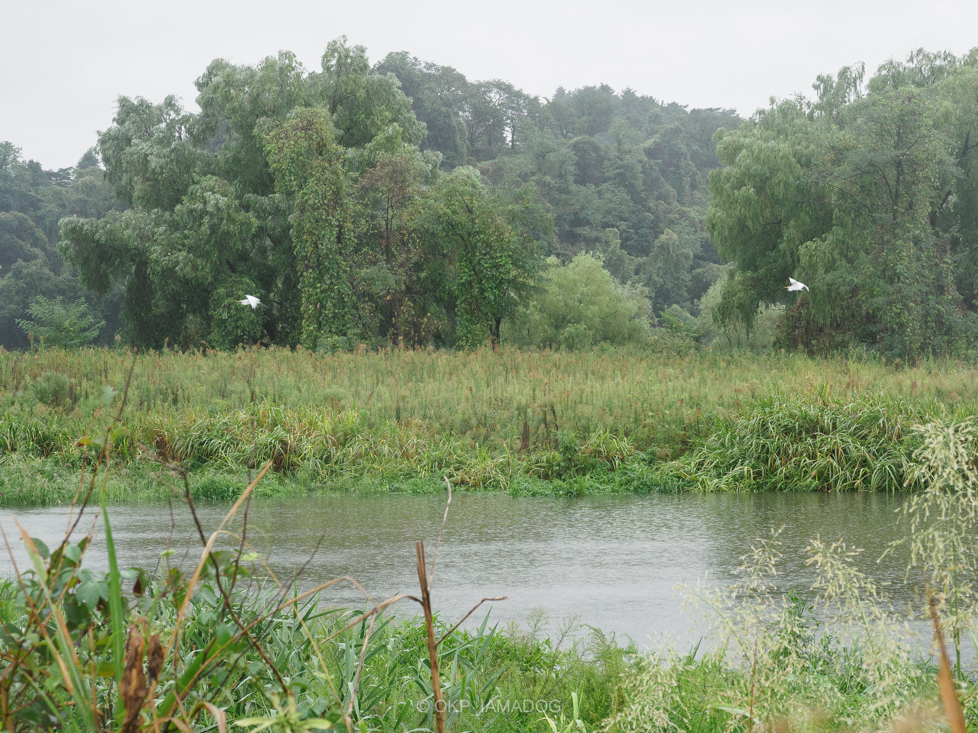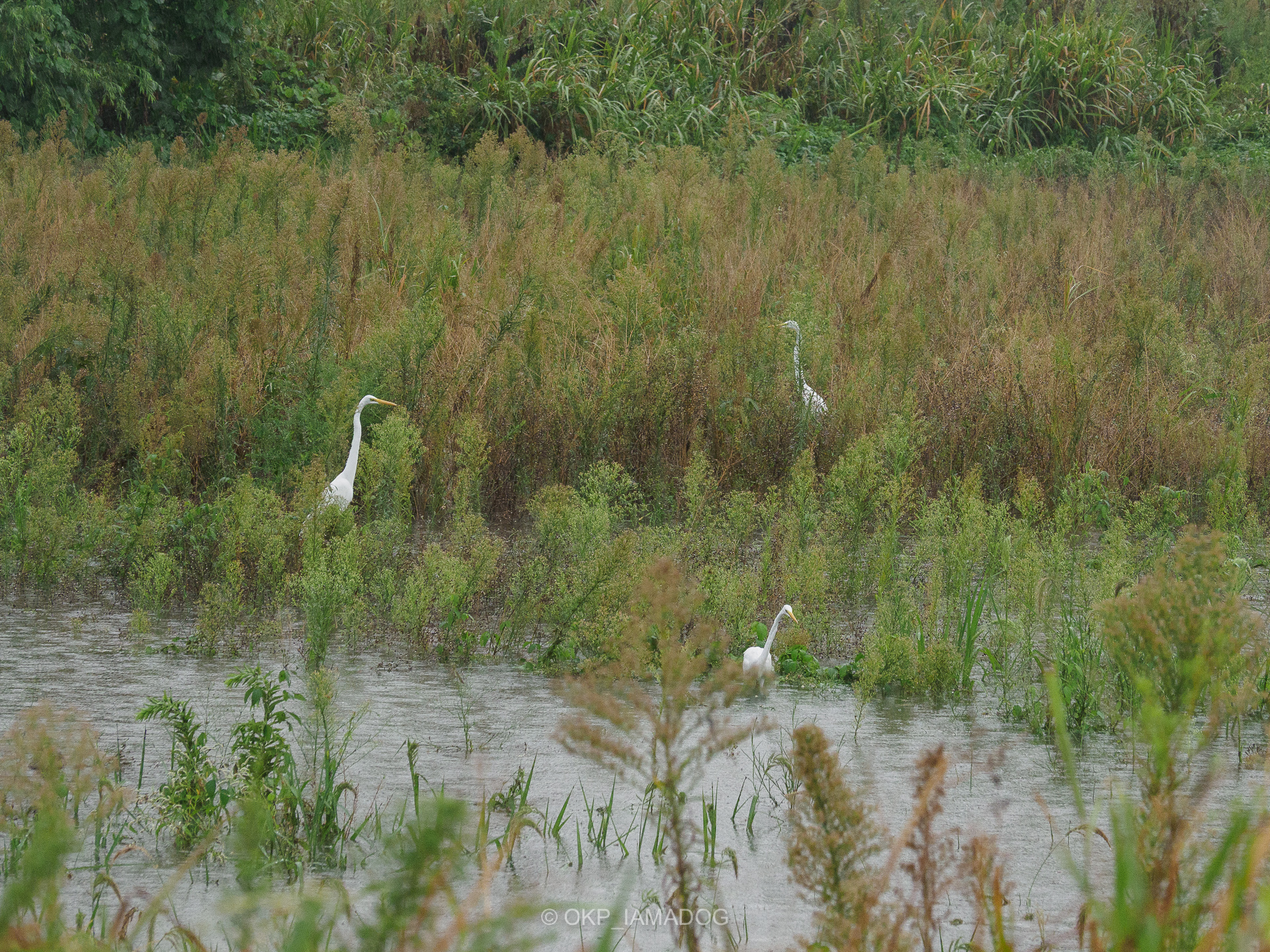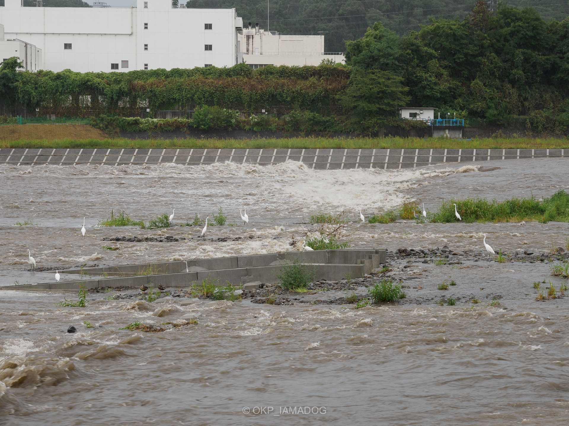 魚道の周囲にはサギ集団。普段はここまで堰周辺に集まっていることはないのですが、増水によりエサ(小魚)が取りやすい浅瀬ができているせいか。