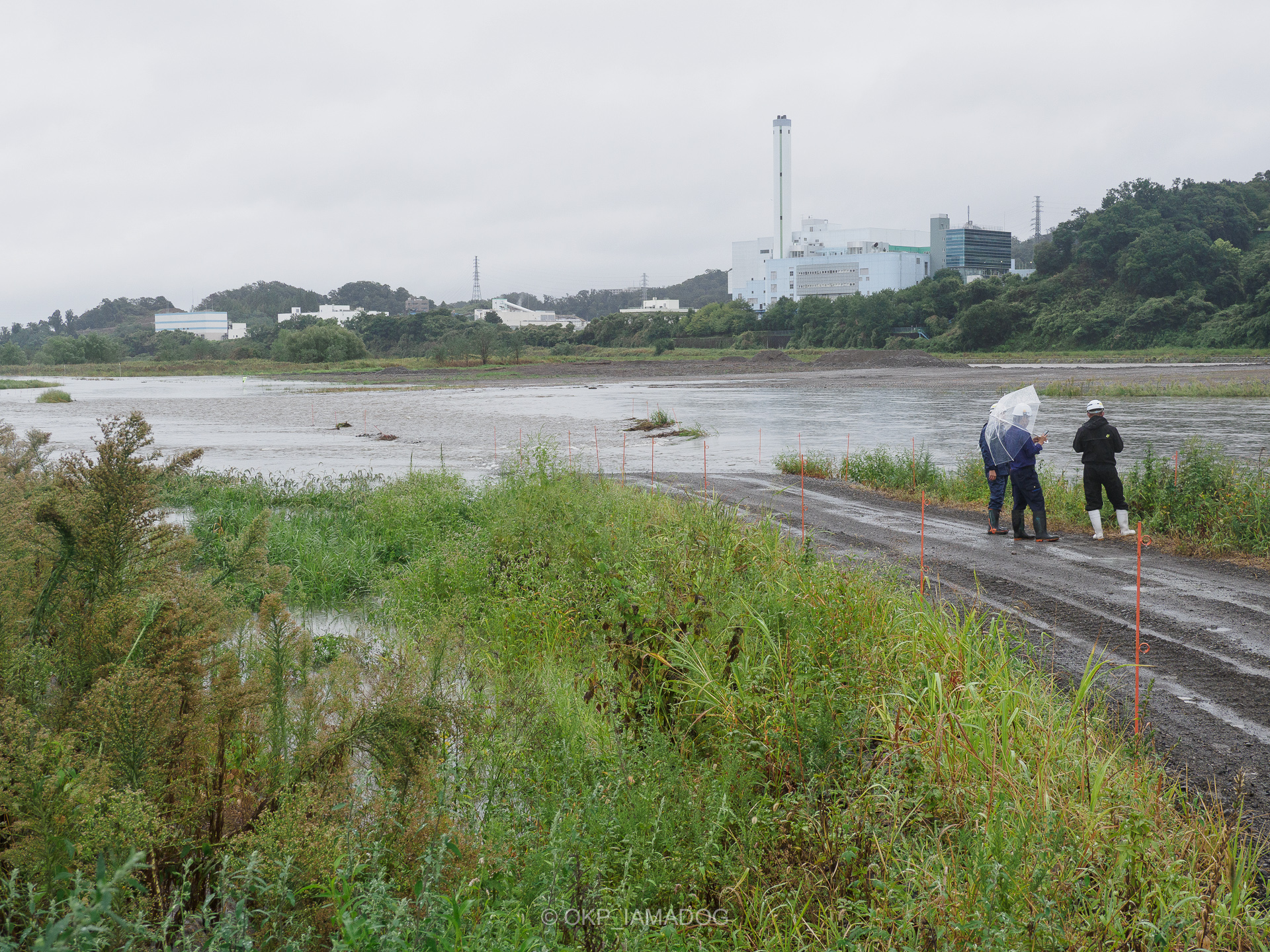工事関係者と思われる方々が低水路の様子を確認しているようでした。高水敷から車や重機を下ろす際に使われているスロープも途中から水没しています。