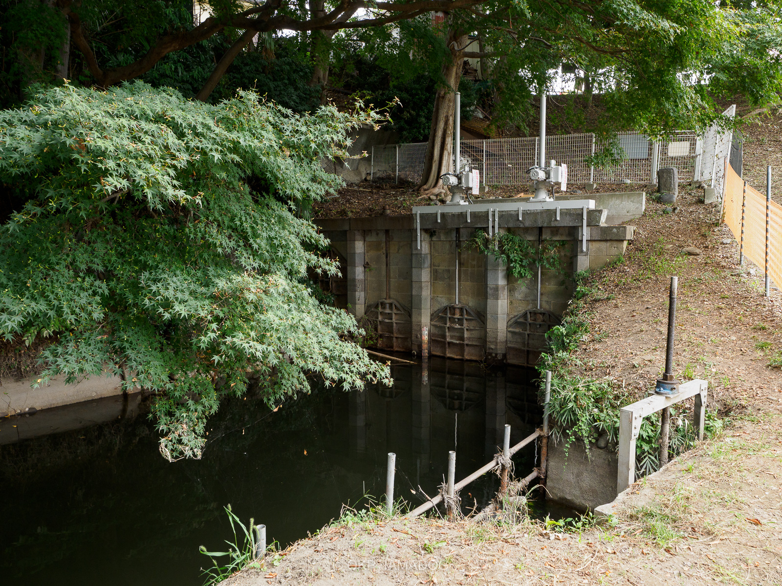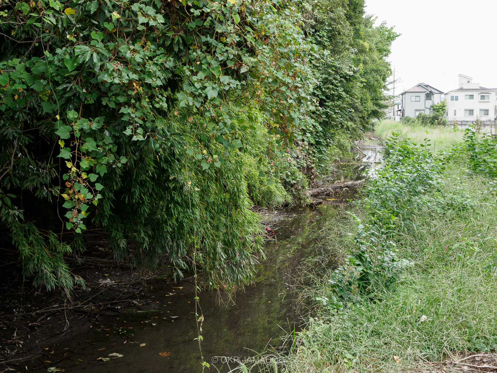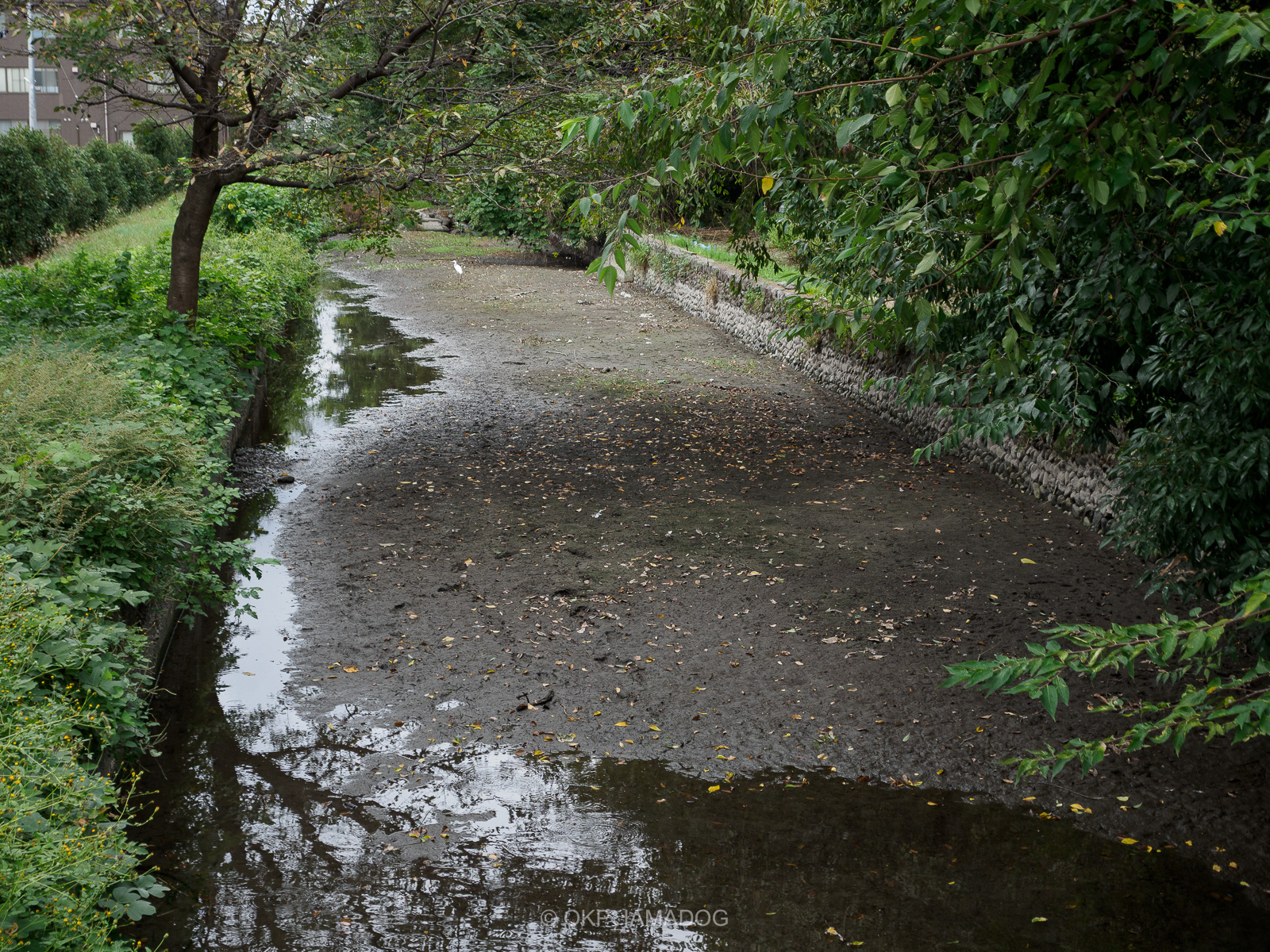 同じく多摩川を水源とする本宿用水(四谷用水)と合流、分岐しながら網の目のように流れる府中用水ですが、多摩川からの通水が終わっても水が涸れない水路を見ることができます。これらの水路には武蔵野台地のハケ(段丘崖)からの湧水が流れているのですが、この時期なら複雑な府中用水の中で湧水を水源としている水路のみを追うことができます。この夏は自転車で走りながら府中用水、本宿用水の流れるエリアを見ていたこともあり、通水を終えた用水路の様子が気になり出かけてみました。