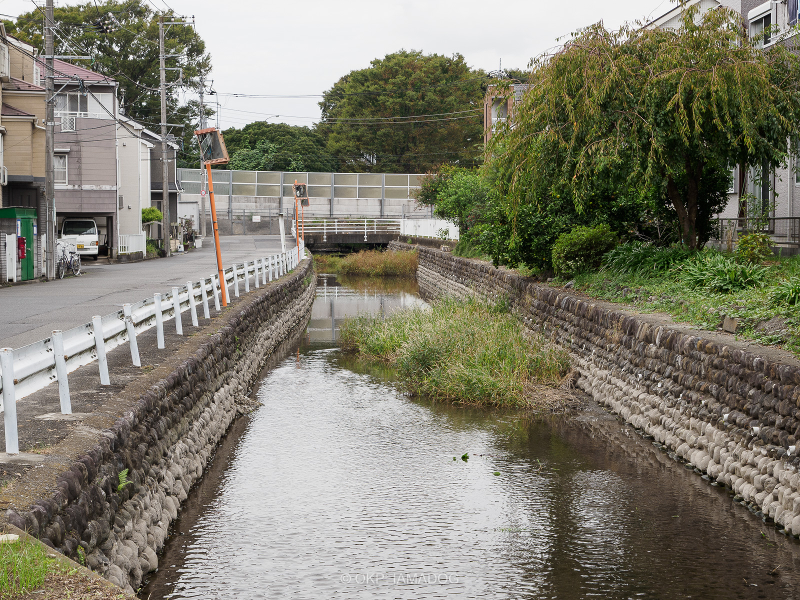 下河原緑道に出る手間で完全に涸れました(写真は上流向き)。あり得るのはこの水路は周辺の田畑に水を送る分水で、メインの新田川は暗渠を流れている可能性。