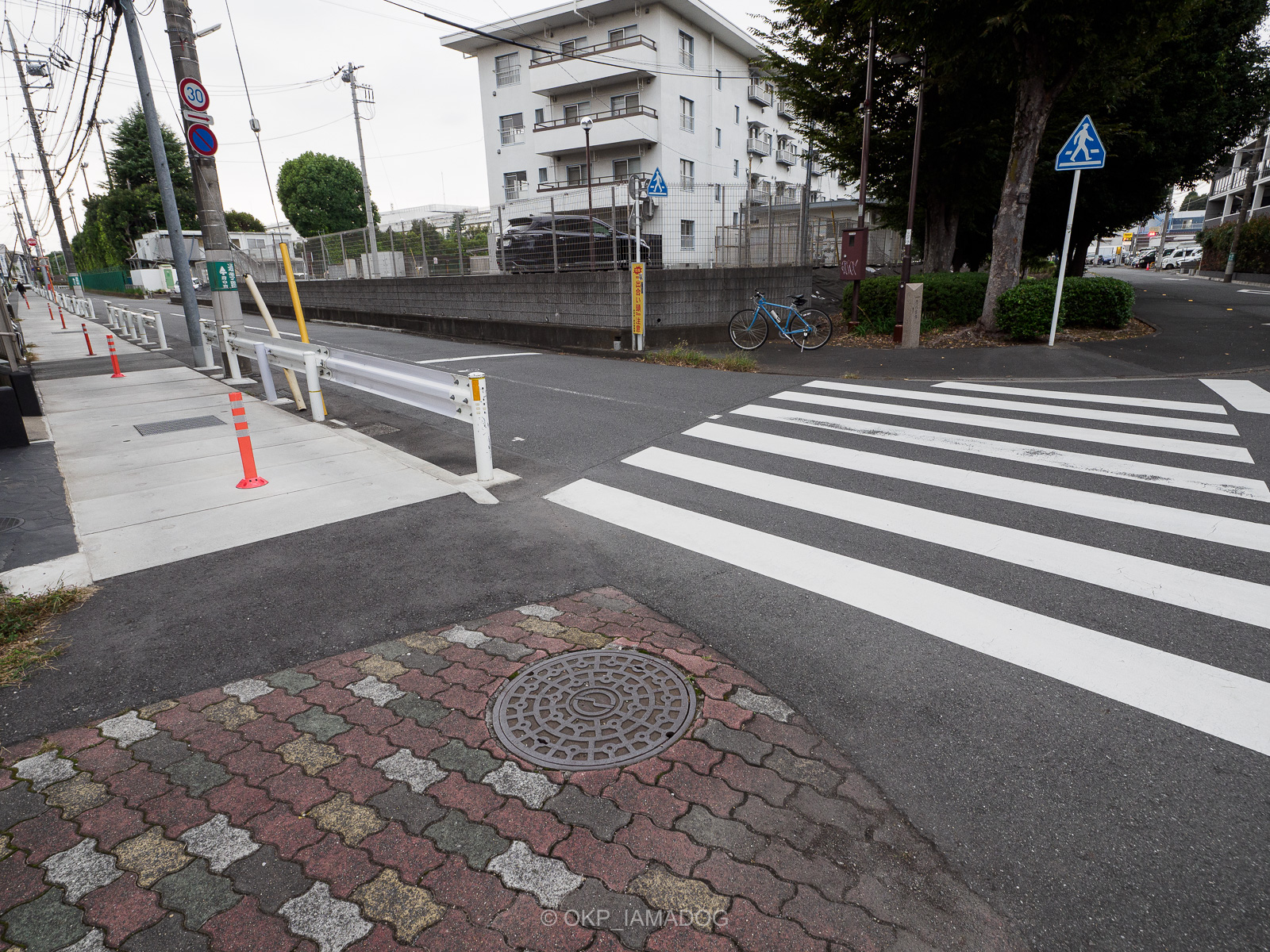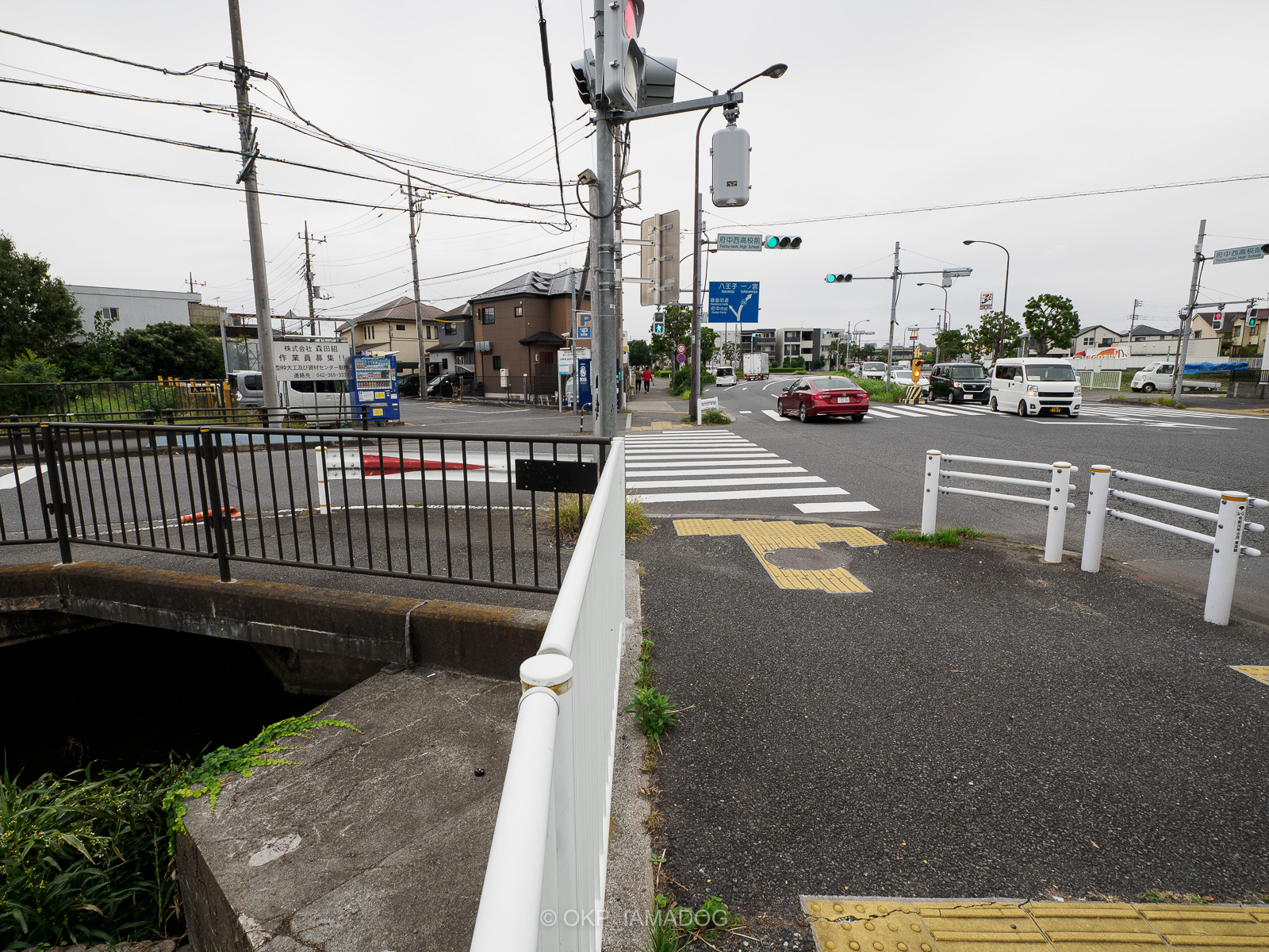 野猿街道を渡りました。写真右奥は八王子方面。府中用水は交差点の下を流れています。左から交差する道が大山道、府中用水の上に「大山橋」が架けられています。