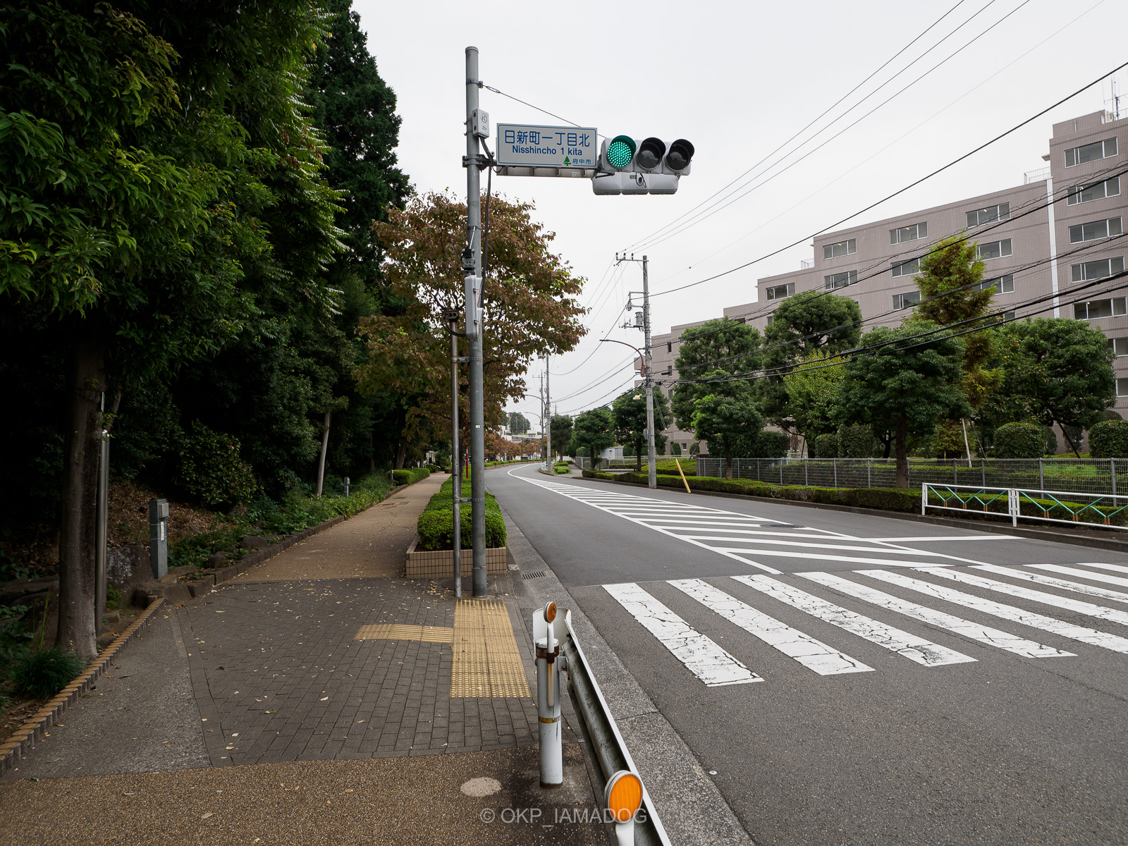 日新通りの日新町一丁目北交差点。ここから先は完全に府中市に入ります。左側が府中崖線の段丘崖で、ハケ沿いの緑道は雨水第二幹線緑道。段丘崖沿いにはハケの湧水を集めた「下の川(市川)」が流れていて、ここで府中用水と合流します(下の川の上流側では谷保分水も合流しています)。