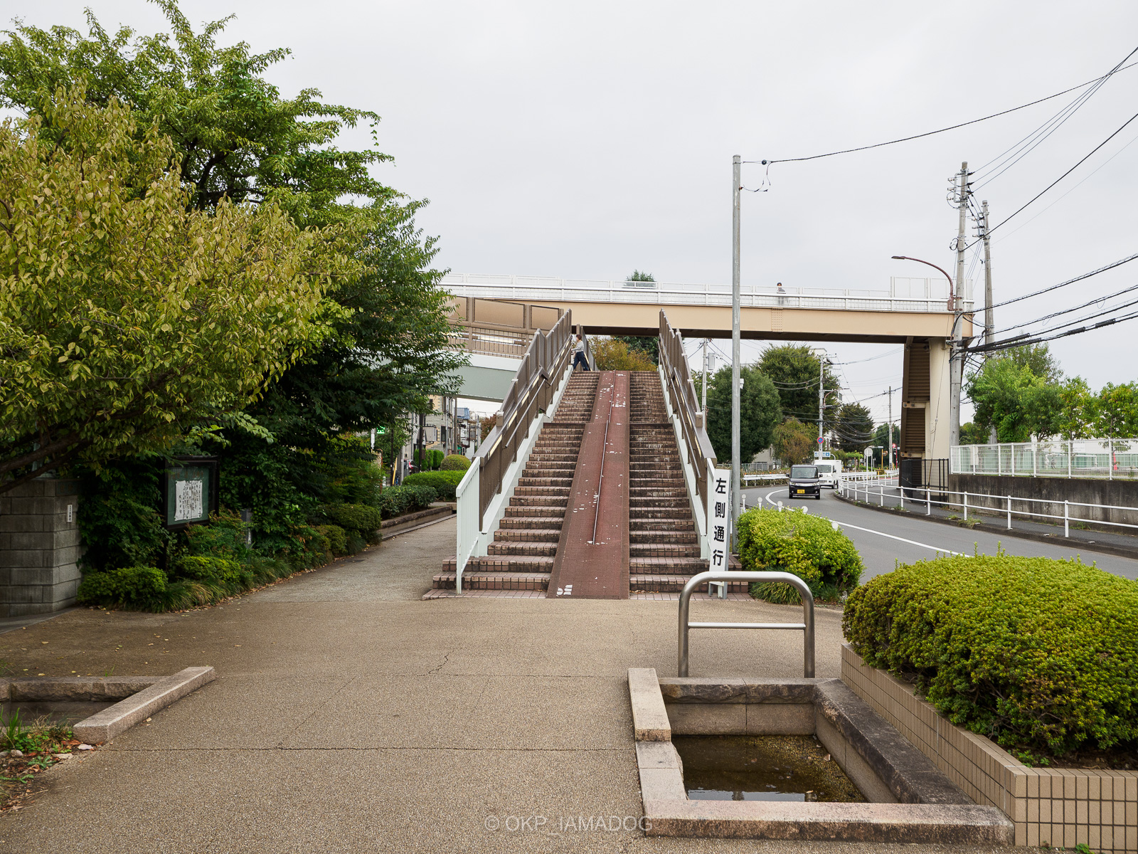 雨水第二幹線緑道と日新通りが分岐します。正面の歩道橋は日新通りと段丘崖を越えてJR西府駅とNECの府中事業場側を結ぶもの。