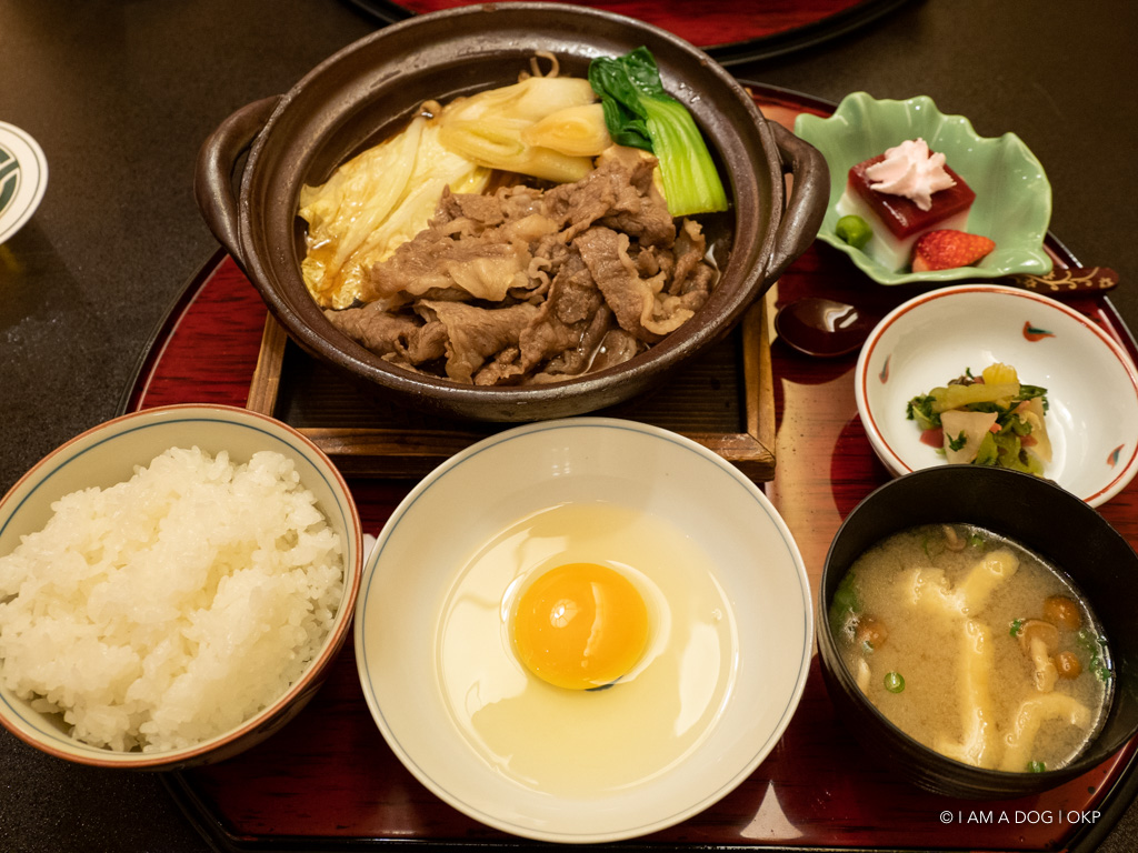 「特選すき焼膳」(並2268円)としばらく飲めない瓶ビールで出国前の乾杯。玉子とご飯のお代わり無料ですが、出国前にもう少し何か摘まみたいので我慢我慢。