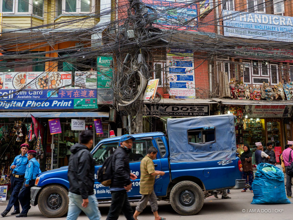 タメル地区を歩いて最初に驚くのが、この強烈な電線…… こんな強力に入り乱れた状態でまともに送電できるの? と思っていたら、初日の夜に3回停電しましたね(笑)(非常用電源があるのか、全ての電源が落ちる訳ではない)
