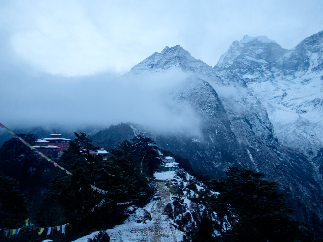 翌朝、目が覚めて外に出てみると日の出前のテンボチェはうっすら雪化粧をしていました。夜中の嵐はいつの間に雪になっていたようで、そして雲が晴れた空が広がっていました。